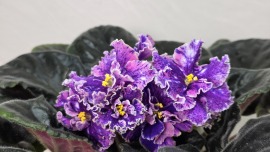 Простые темно-синие цветы с обильнейшим белым фентази в виде белого гороха. Шапочное цветение, ровная идеальная розетка из темно-зеленых с розовой Tommie Lou пестролистностью листьев.