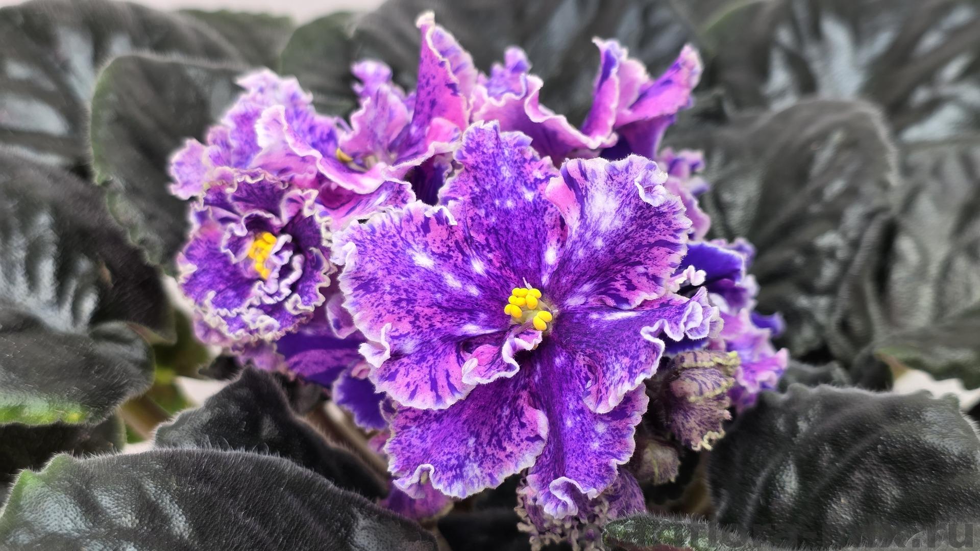 Крупные полумахровые розовые звёзды. Сложный окрас. Основной, розовый тон местами с ярким сиреневым напылением. Двойное фентази - белый горох и множественные штришки фиолетового цвета. Эффектная бело-зеленая кайма по краю лепестков.